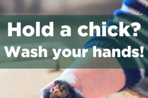 Always wash your hands before and after you interact with your chicks! Salmonella, a bacteria that can make people sick, can spread from your baby chicks to you, so don’t kiss them or touch them to your face.