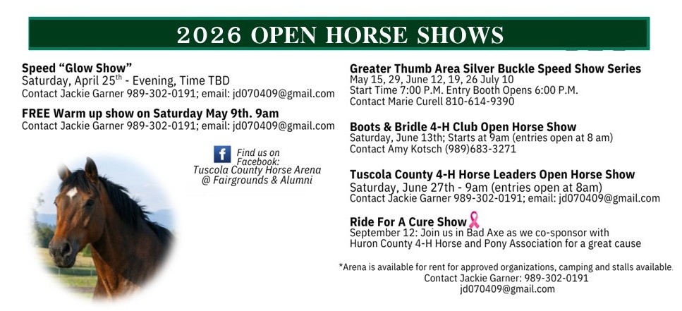 Horse Show schedule for 2026 - All shows are Open and held at the Tuscola County Fairgrounds unless otherwise stated.