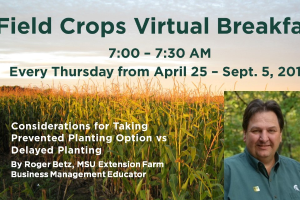 The MSU Extension Field Crops Virtual Breakfast weekly topic for May 30, 2019, focused on taking prevented planting option vs delayed planting, presented by Roger Betz, MSU Extension farm business management educator.